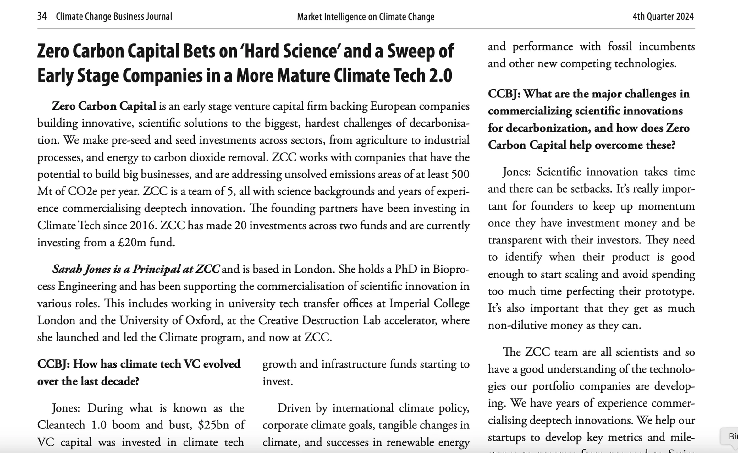 Zero Carbon Capital has been featured in the latest edition of Climate Change Business Journal Q4 2024: Climate Change Industry Overview 2024. The edition explores key trends shaping the climate sector, and we’re honoured to be part of the conversation. ZCCs Sarah contributed insights in a 3 page feature on the evolution of climate tech VC, the challenges of scaling deeptech innovations, and the critical role of hard-science startups in decarbonisation.