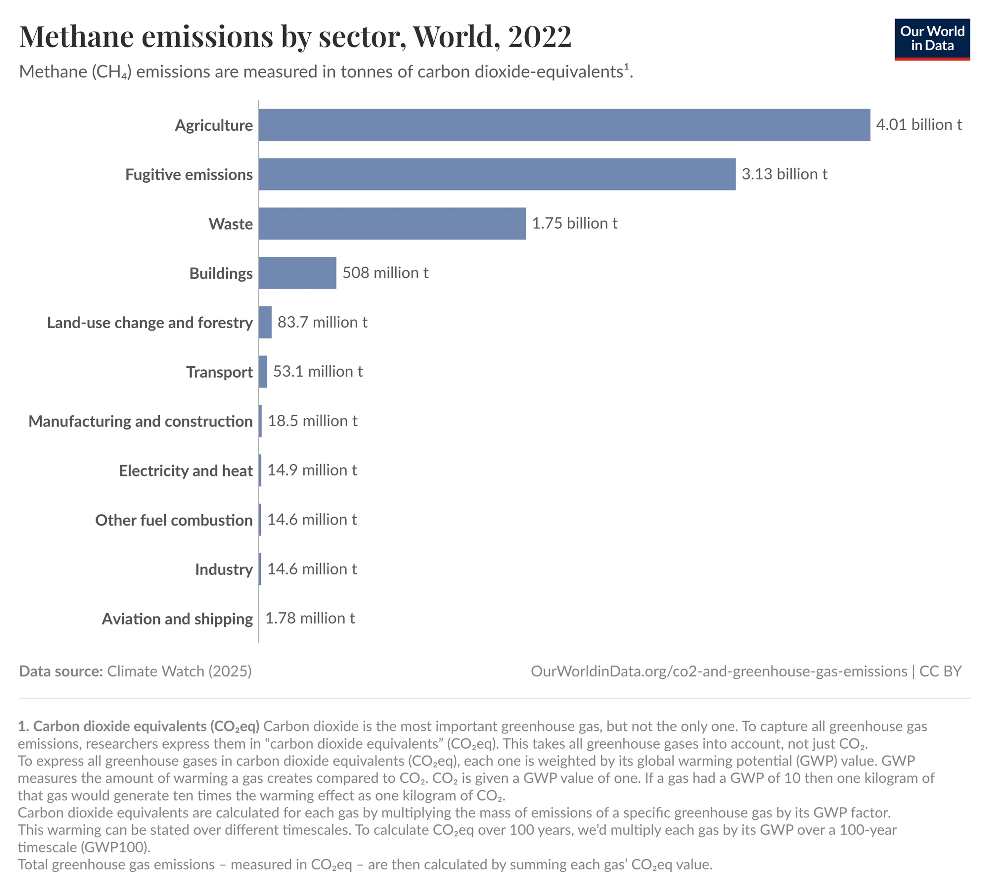 Anthropogenic methane is produced from three main sources: livestock emissions (mostly from cattle burps and some from manure), fugitive emissions from the fossil fuel industry (gas leaks from oil & gas extraction), and waste (from the anaerobic breakdown of organic matter in solid waste and wastewater). Livestock emissions are the highest of these (by volume and per capita), and most of this comes from the world’s 1.5 billion cattle.