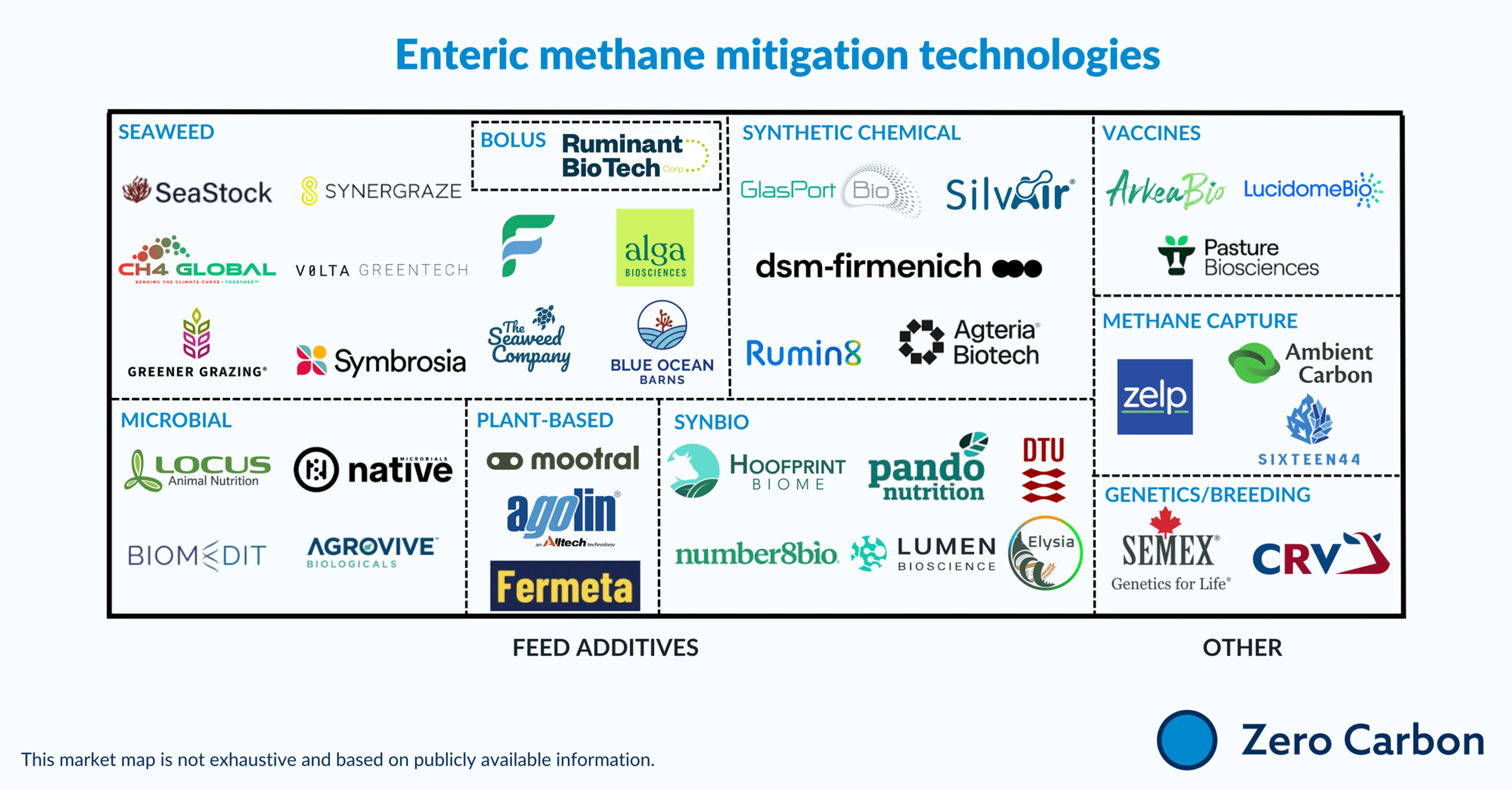 Zero Carbon's market map of enteric methane interventions based on the categorisation described above. Note that categorisations are based on publicly available information, and that the list of companies is not exhaustive.
