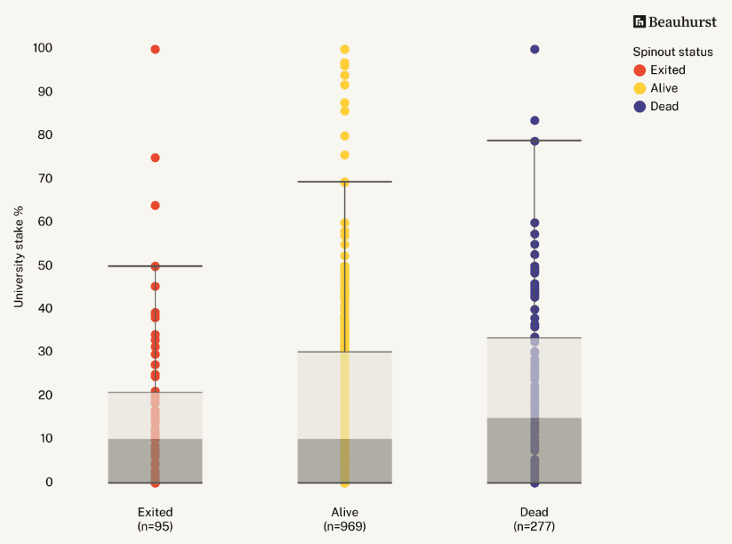 And data reveals that spinouts with lower university equity stakes at incorporation are more likely to be successful, according to a study published in 2023 by Beauhurst and the Royal Academy of Engineering, based on UK spinouts between 2011-2023.