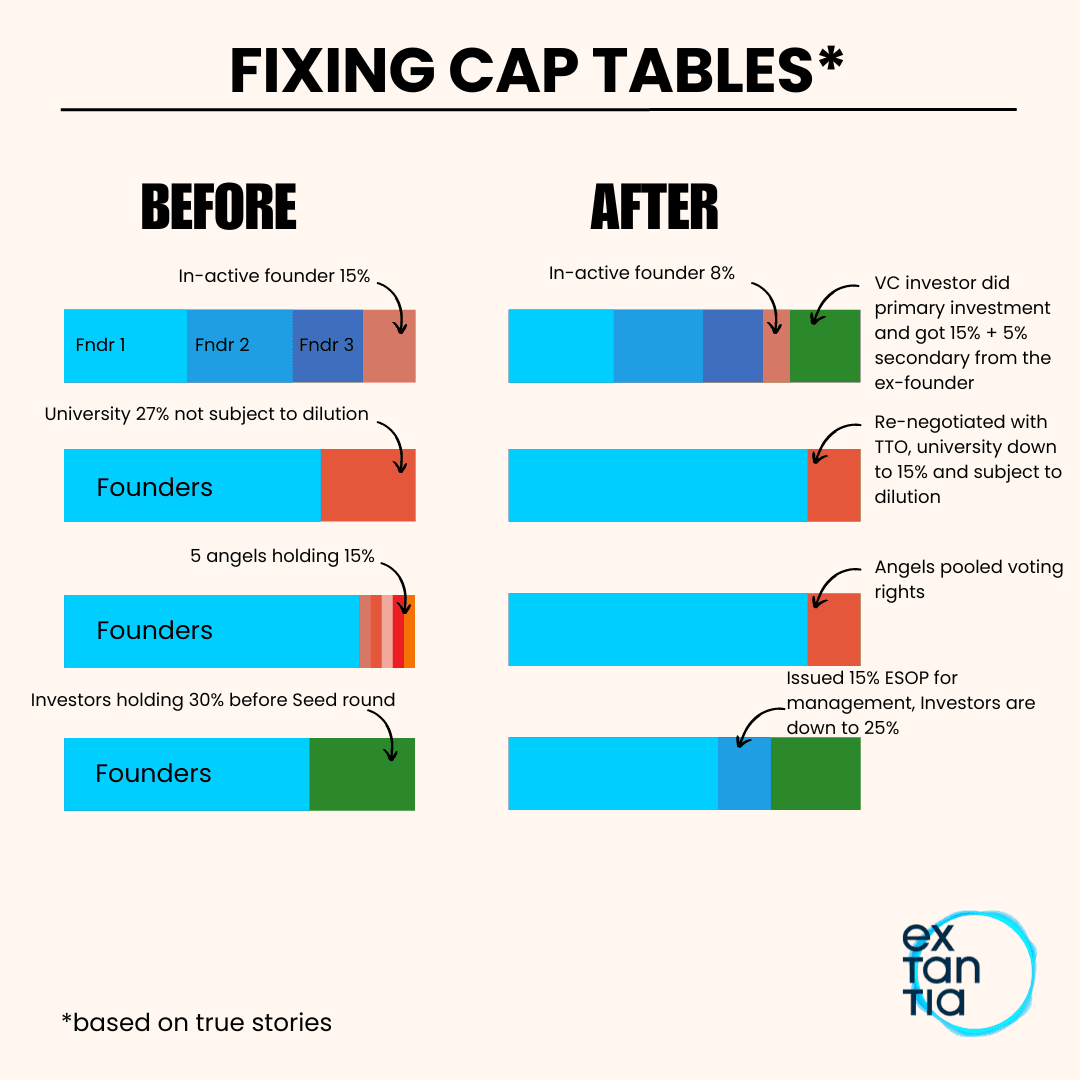 Next, start a dialogue with the relevant parties. If there are dormant shareholders, explore options such as buybacks, secondaries, or stock dilution. Negotiating with universities, accelerators, or angel investors may be necessary to balance the cap table in favour of the executive team and future investors.